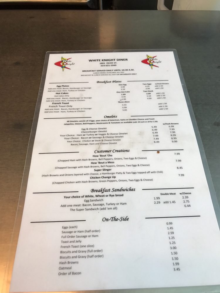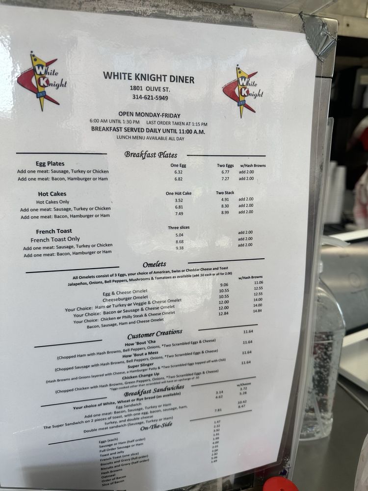 White Knight Diner, located in Saint Louis, MO, is a hidden gem offering American diner classics with a vintage feel. With a menu featuring lunch plates like the juicy hamburger and specialty items like the Chicken Bacon Swiss sandwich, it's a perfect spot for a delicious meal. Customers rave about the fresh and flavorful food, with standout items like the perfectly cooked pancakes and the famous Super Slinger breakfast dish. The cozy atmosphere and friendly staff add to the charm of this neighborhood spot, making it a must-visit for anyone in the area. Don't miss out on the chance to experience the old-school charm and tasty dishes at White Knight Diner.